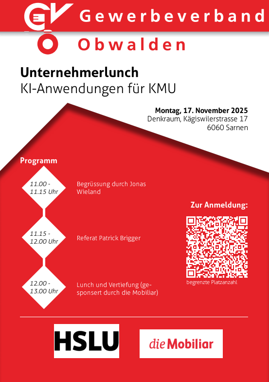 Der Gewerbeverband Obwalden organisiert zusammen mit der Hochschule Luzern und der Mobiliar zwei Unternehmerlunchs. Der zweite Anlass findet am Montag, 17. November 2025 um 11.00 Uhr im DENKRAUM an der Kägiswilerstrasse 17 in Sarnen statt.